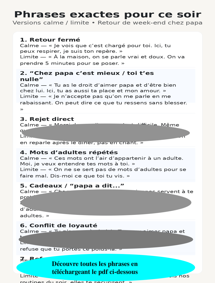 Télécharge les phrases exactes à dire ce soir + le rituel 5 minutes pour réparer le lien après le week-end chez son père.